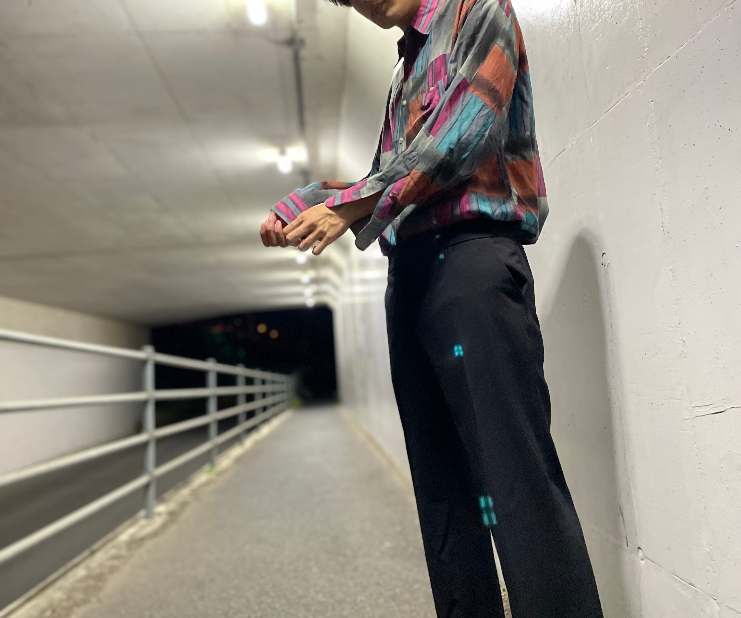 こういうシャツって、どうしてもぱっと見の印象はかなり派手で着るのに抵抗感を覚えやすいと思うのですが、ルックのように下を完全な黒でまとめると、驚くほどに自然に綺麗にまとまります。