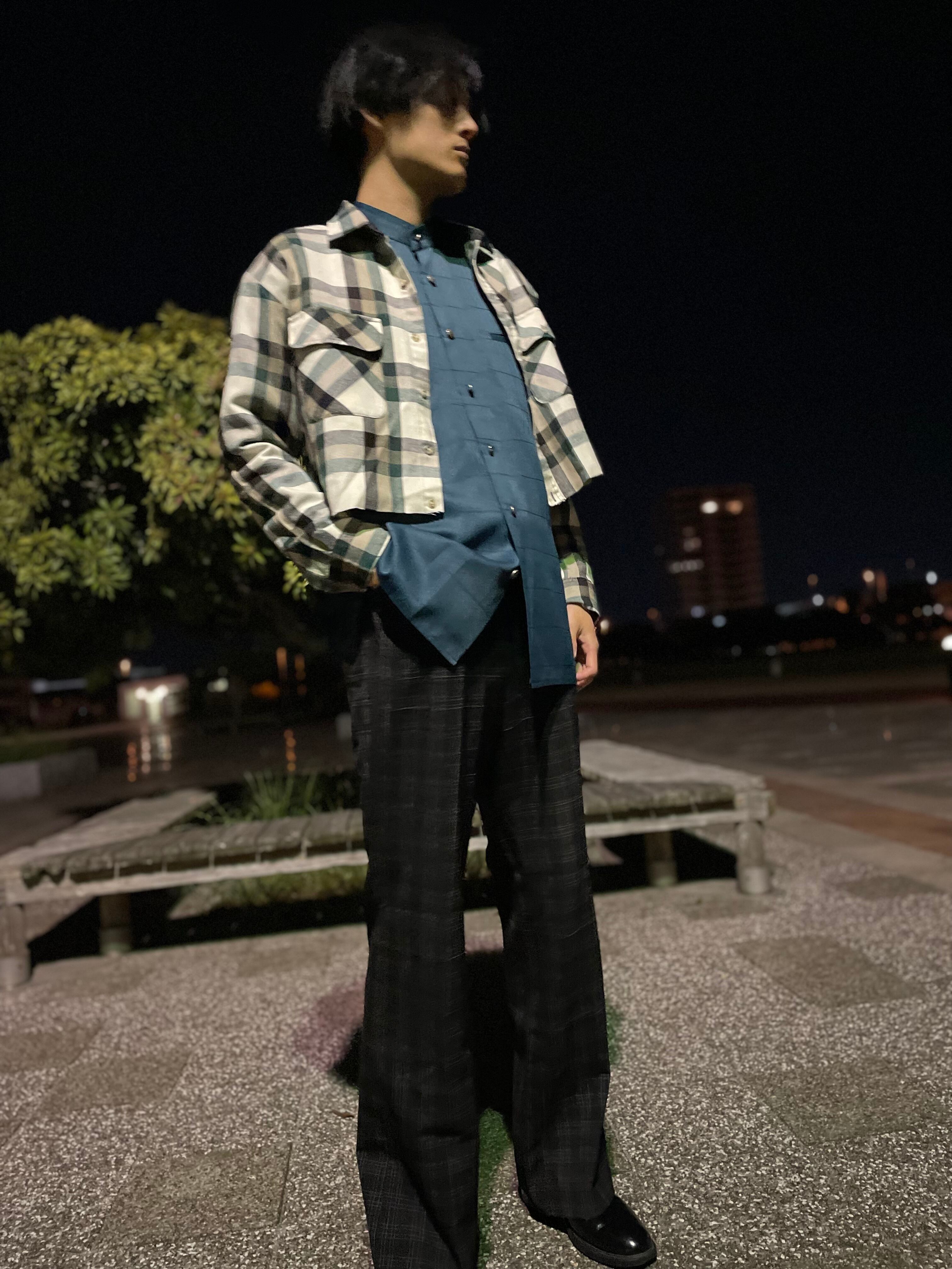 ショート丈のチェックシャツ。